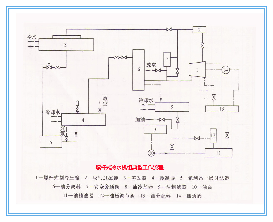螺桿式冷水機(jī)組的典型工作流程如下圖所示,它由制冷系統(tǒng)和潤滑油系統(tǒng)兩部分組成。制冷系統(tǒng)的工作流程為:制冷劑在蒸發(fā)器中汽化,所產(chǎn)生的蒸氣經(jīng)過吸氣過濾器進(jìn)入壓縮機(jī)。制冷劑在壓縮機(jī)中被壓縮成高壓氣體,同時(shí)潤滑油噴入壓縮機(jī)中與制冷劑一起被壓縮,壓縮后潤滑油和制冷劑進(jìn)入油分離器,其中無油的制冷劑進(jìn)入冷凝器,在冷凝器中變?yōu)轱柡鸵后w后進(jìn)入過冷器過冷,變?yōu)檫^冷液體,然后流向節(jié)流閥,經(jīng)過節(jié)流降壓降溫后進(jìn)入蒸發(fā)器。潤滑油系統(tǒng)由油分離器、油冷卻器、油過濾器、油泵、油壓調(diào)節(jié)閥、油分配器和四通閥組成,其工作流程為:從油分離器分離出來的潤滑油,為避免油溫過高降低潤滑性,先經(jīng)過油冷卻器進(jìn)行冷卻,然后在沒泵作用下經(jīng)過油粗濾器、油精濾器進(jìn)入油分配器,接著分成兩路進(jìn)入壓縮同。一路去潤滑軸承并起冷卻作用,另一路去壓縮機(jī)噴射。