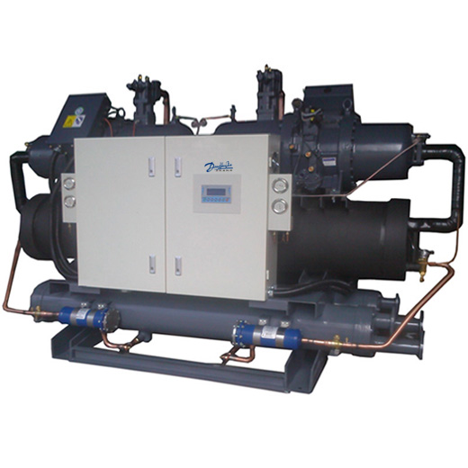 螺桿式冷水機(jī)因其關(guān)鍵部件壓縮機(jī)采用螺桿故名螺桿冷水機(jī),機(jī)組由蒸發(fā)器出來的狀態(tài)為氣體的冷媒;經(jīng)壓縮機(jī)絕熱壓縮以后,變成高溫高壓狀態(tài)。被壓縮后的氣體冷媒,在冷凝器中,等壓冷卻冷凝,經(jīng)冷凝后變化成液態(tài)冷媒,再經(jīng)節(jié)流閥膨脹到低壓,變成氣液混合物。